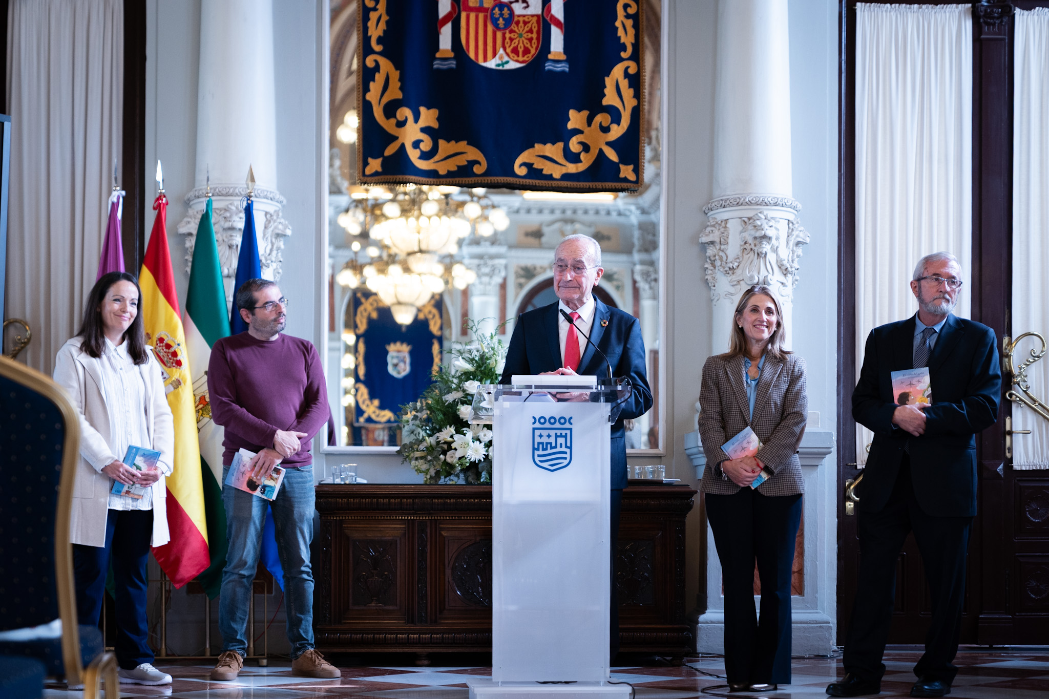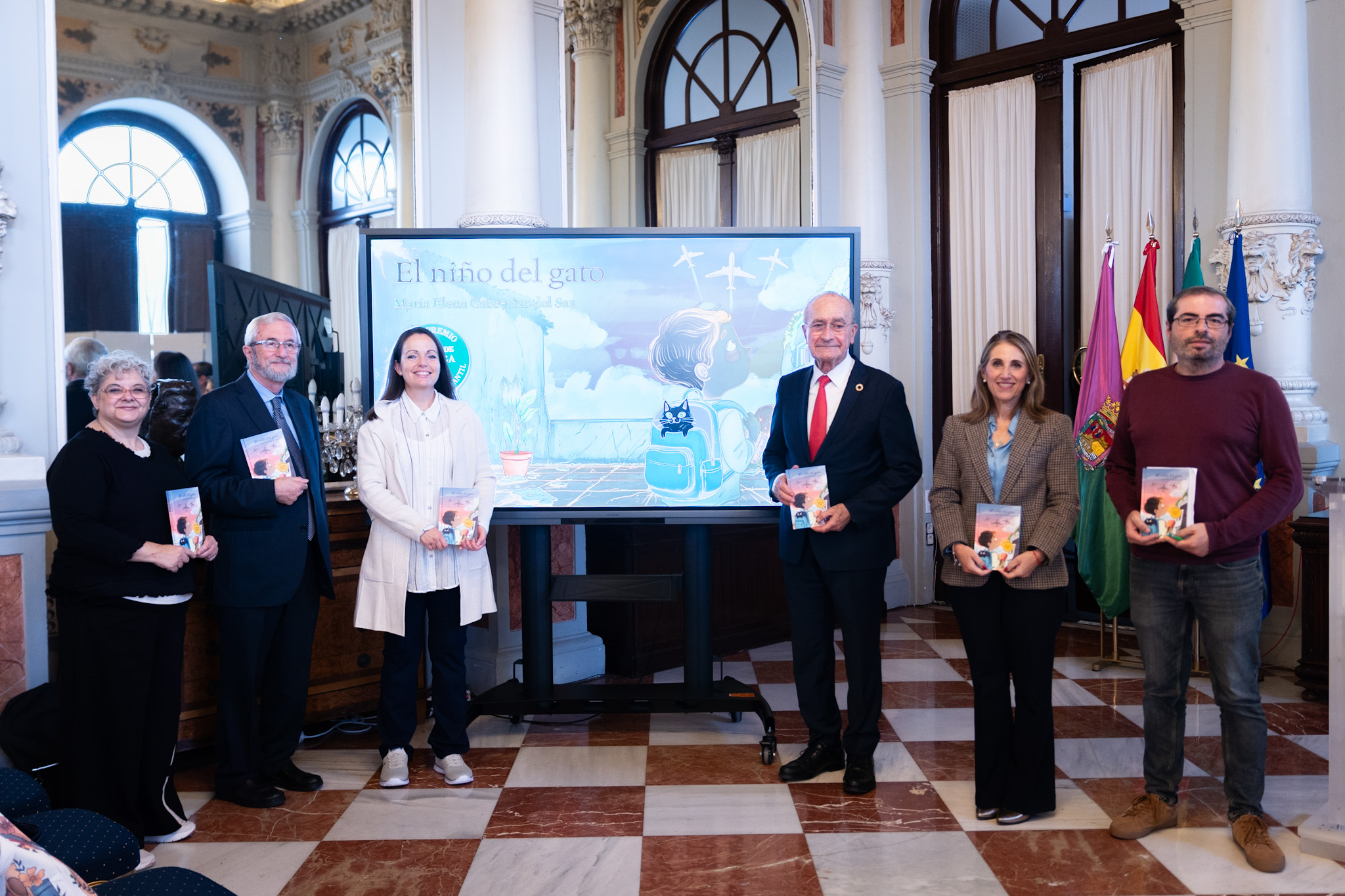 El alcalde de Málaga, Francisco de la Torre, acompañado por la concejala delegada de Educación, María Paz Flores, ha presentado hoy en el Salón de los Espejos del Ayuntamiento el libro ‘El niño del gato’, obra ganadora del XVI Premio Internacional de Literatura Infantil Ciudad de Málaga. En el acto también ha estado presente la autora del libro, María Elena Cabrerizo del Saz; el director editorial de Anaya Infantil y Juvenil, Pablo Cruz; y el coordinador del premio y miembro del jurado, Antonio Gómez Yebra.